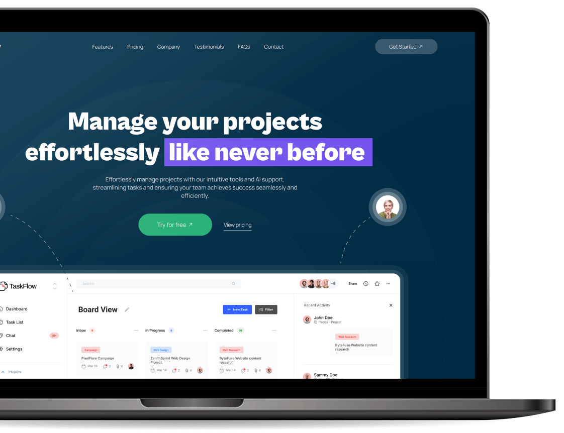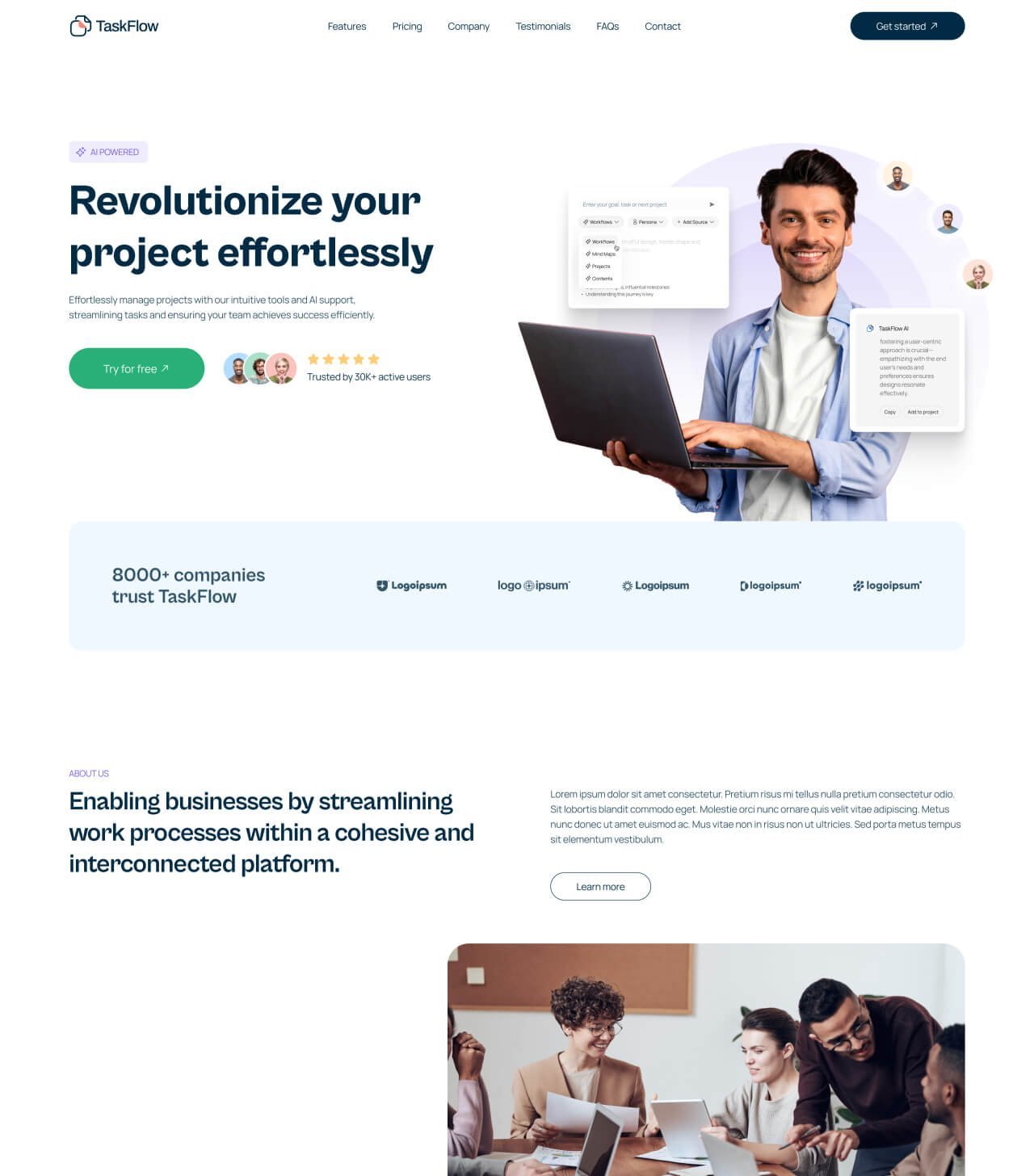 Saas marketing landing page design for AI powered project managent tool.